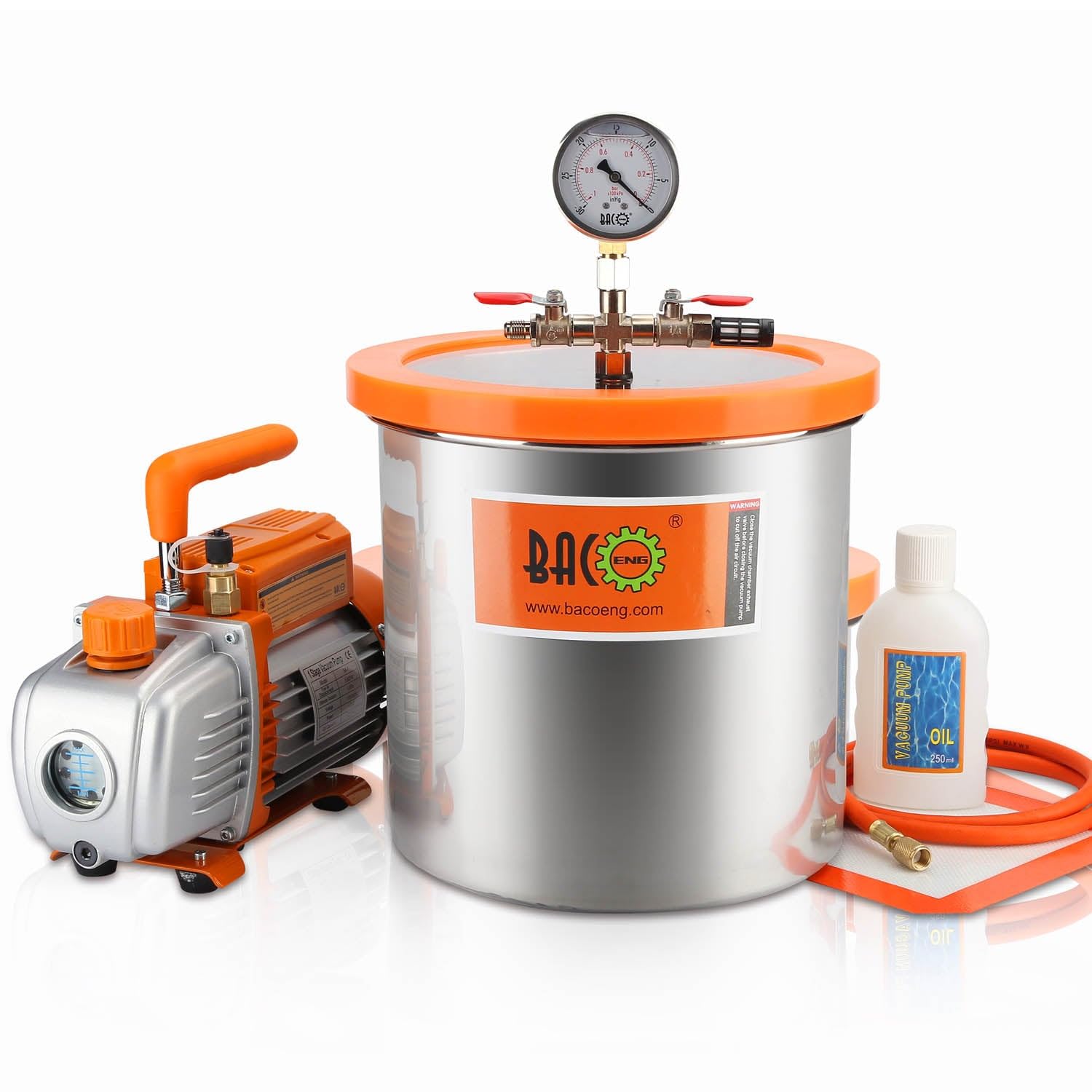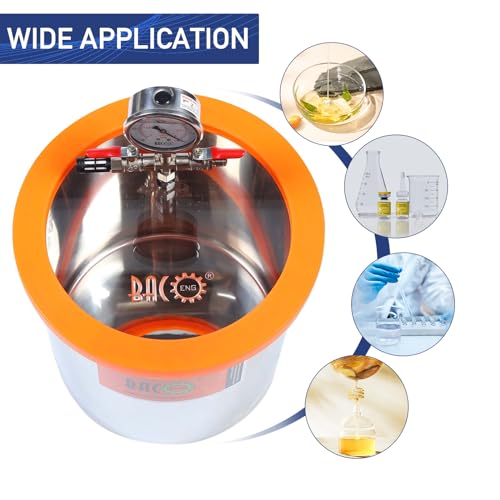 - 【𝟑𝐆𝐀𝐋𝐋𝐎𝐍 𝐕𝐀𝐂𝐔𝐔𝐌 𝐂𝐇𝐀𝐌𝐁𝐄𝐑】Strong and durable stainless steel container with square silicone gasket. Silicone gasket to be used over 10,000 times without deterioration. Measuring range of vacuum gauge:0-30inHg, 5 Feet Reinforced Vacuum Hose Connect Directly To Vacuum Pump 1/4″ SAE.