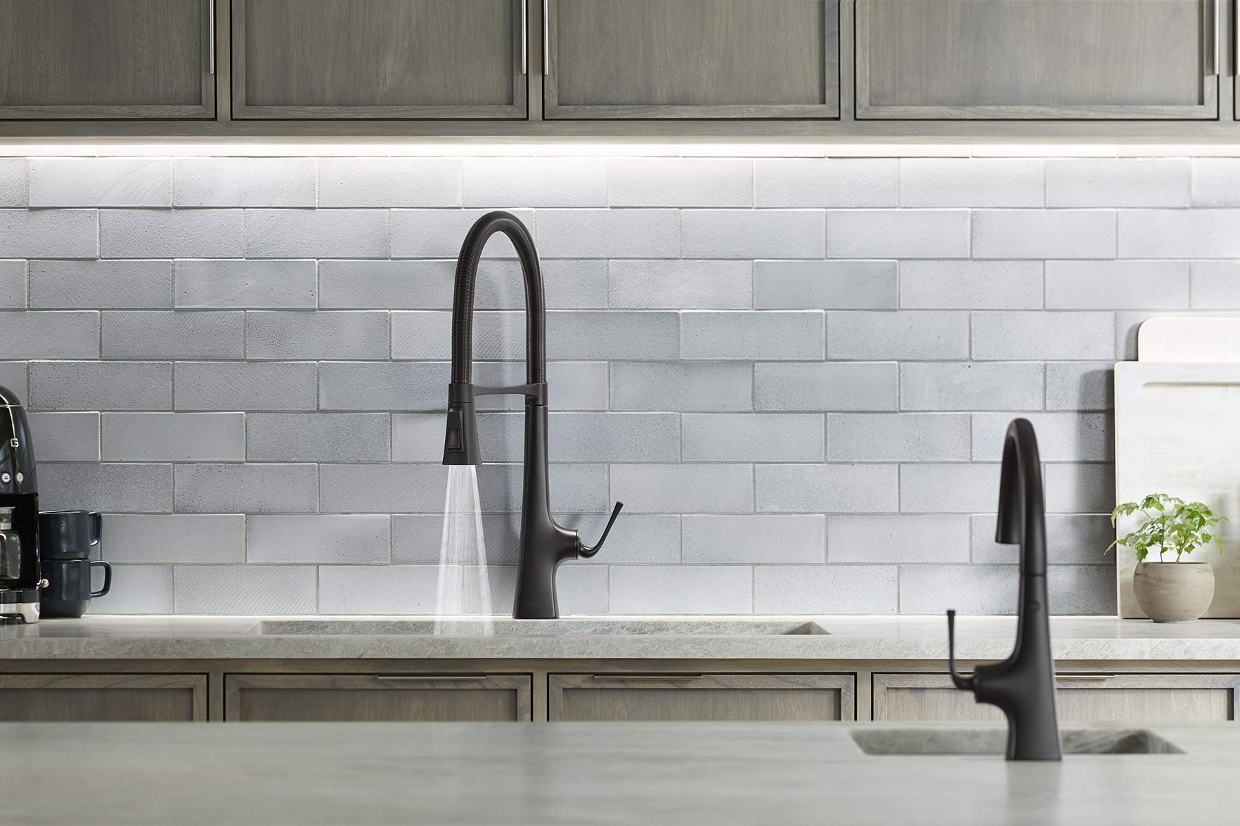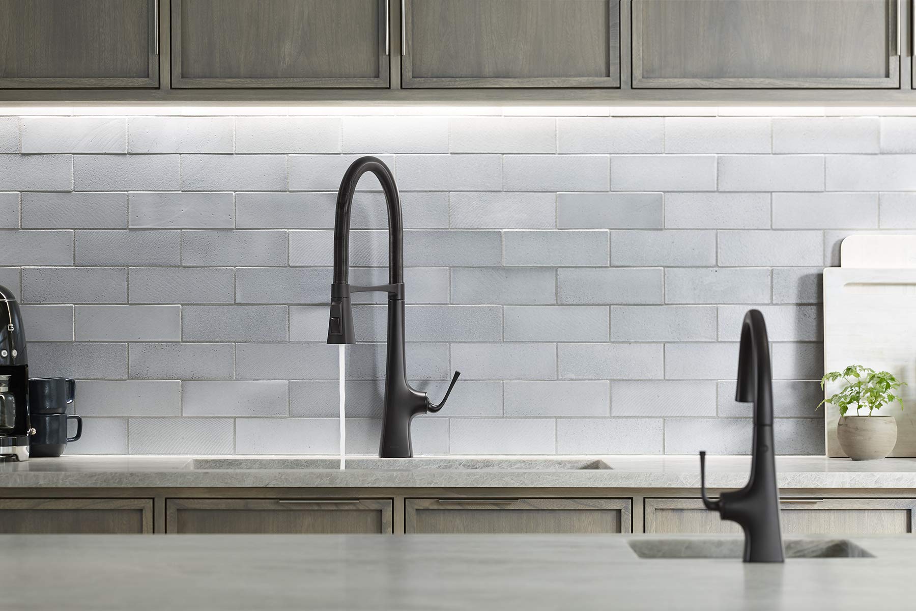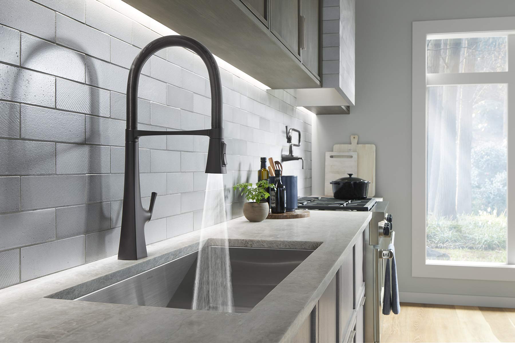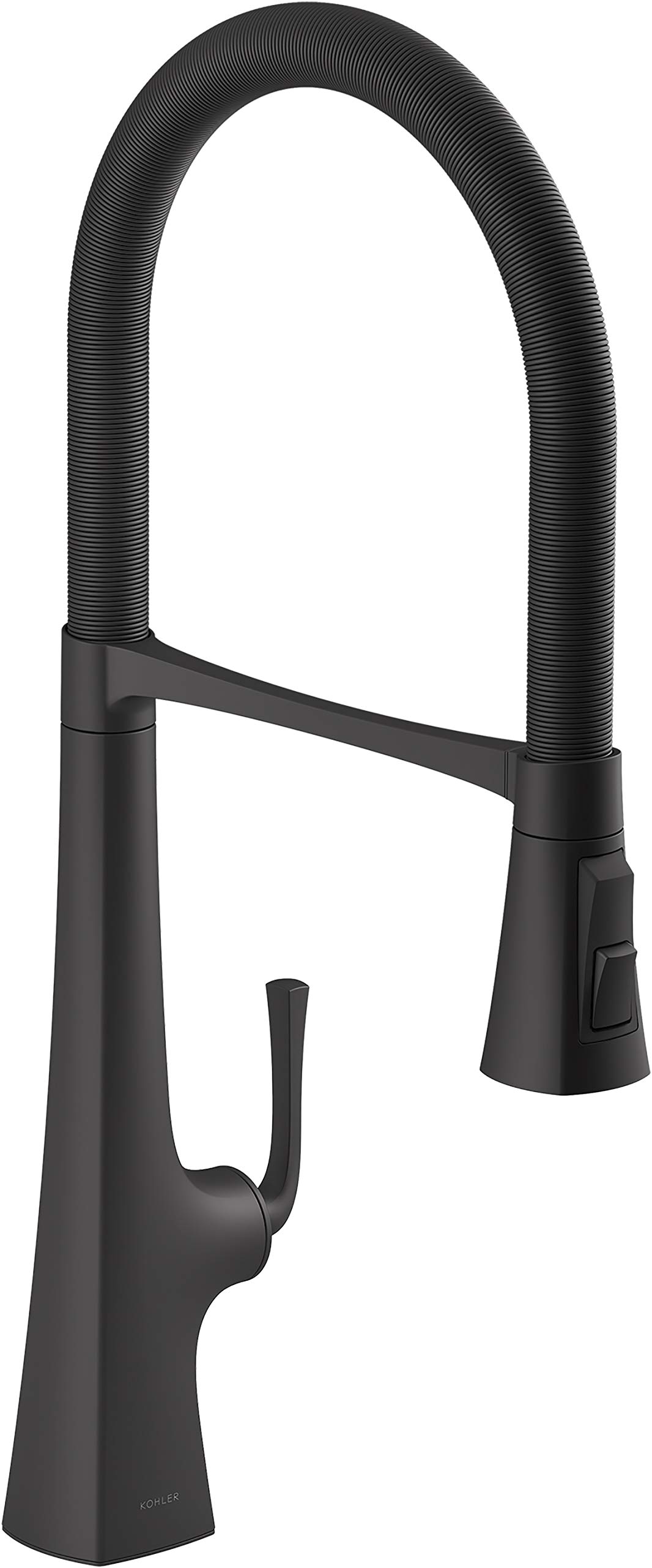- Semi-professional kitchen faucet with finish-matched easy-clean hose cover.