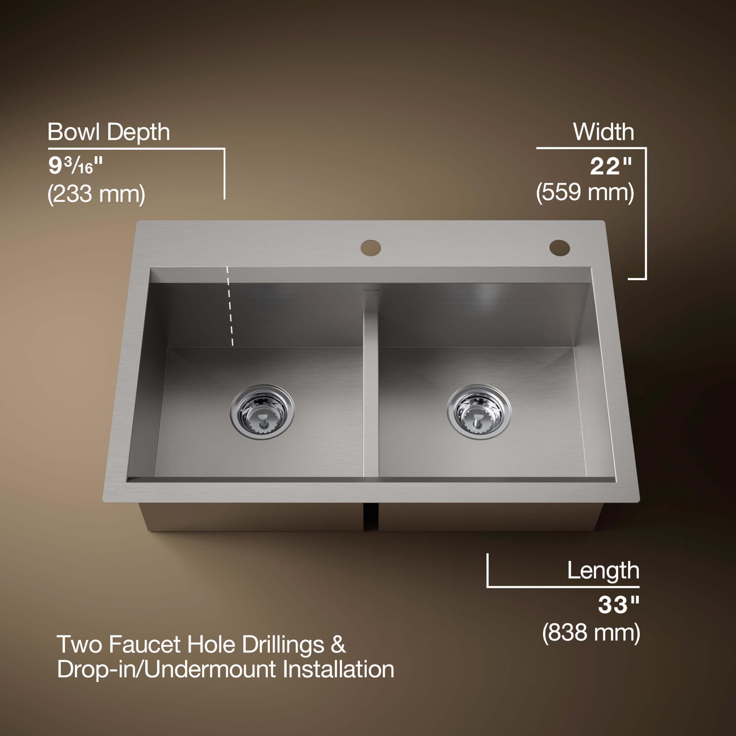 KOHLER Task Smart Divide 33″ Top-/Undermount Double-Bowl Workstation Kitchen Sink, Includes Accessories, Stainless Steel, 2 Faucet Holes, K-80085-2PC-NA