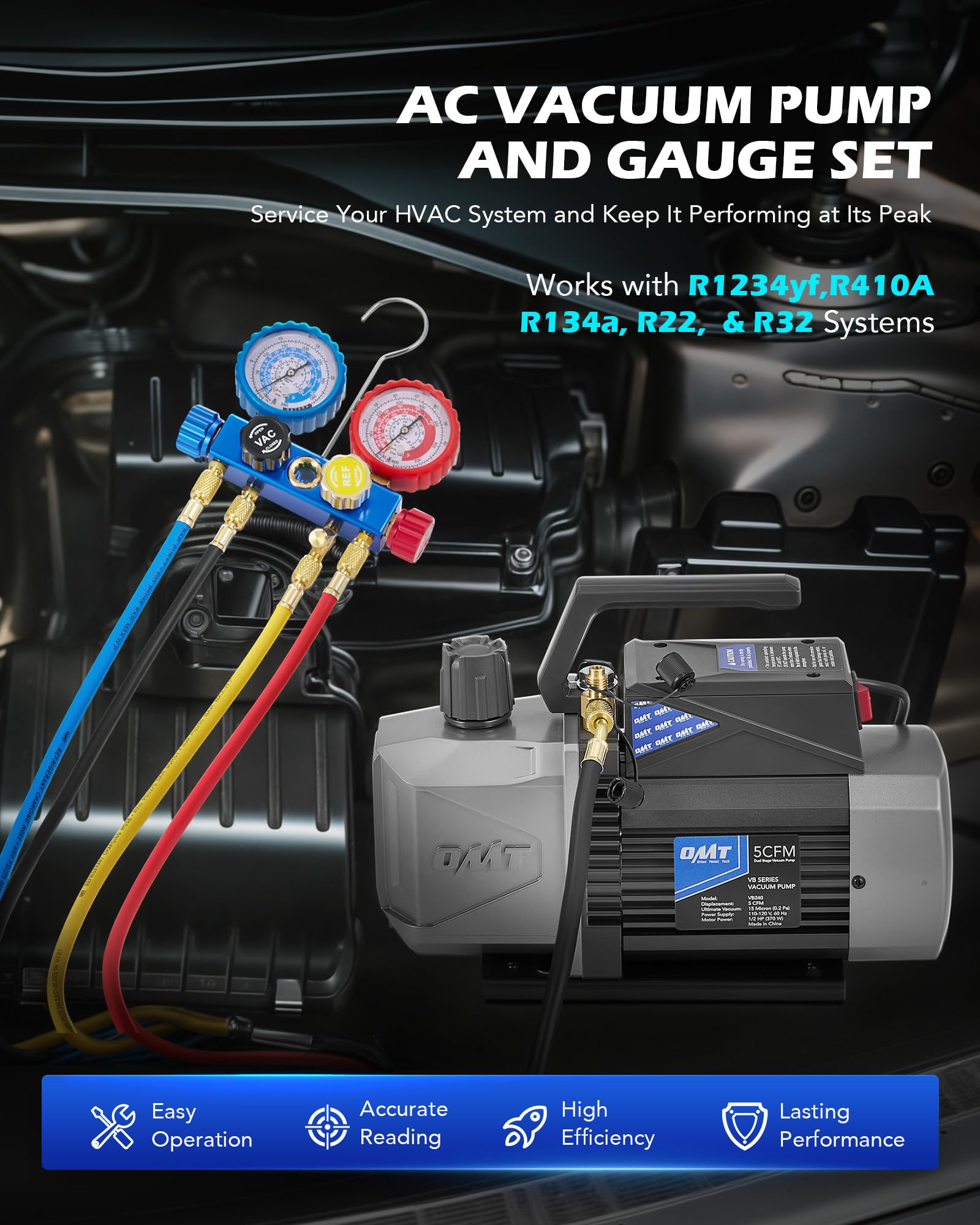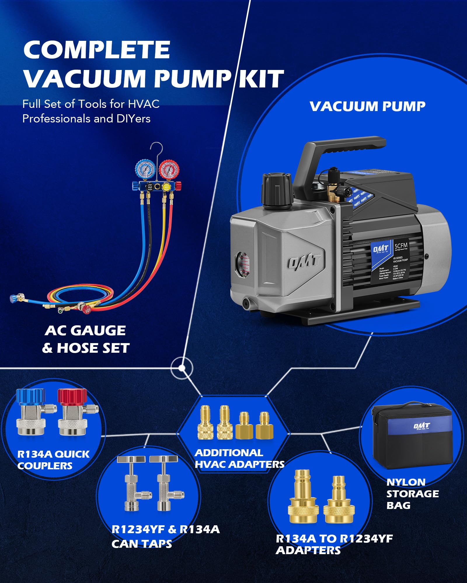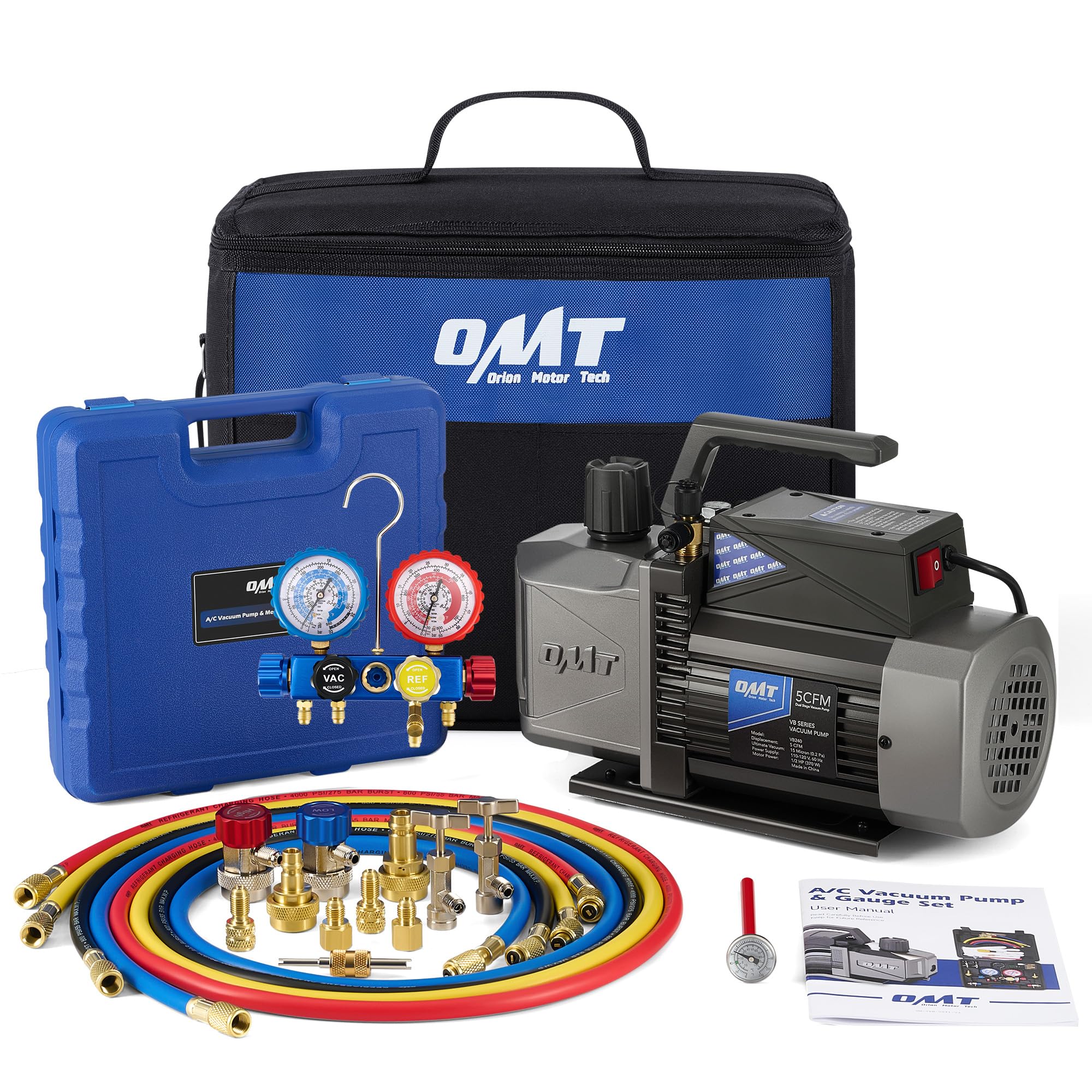 - Auto AC Service Set: Orion Motor Tech’s auto AC vacuum pump kit includes a 1/2 hp vacuum pump, a 4-way manifold gauge, R134a & R1234yf self-sealing can taps, R134a quick couplers, R134a to R1234yf adapters, vacuum oil, and 4 hoses for most AC repair works