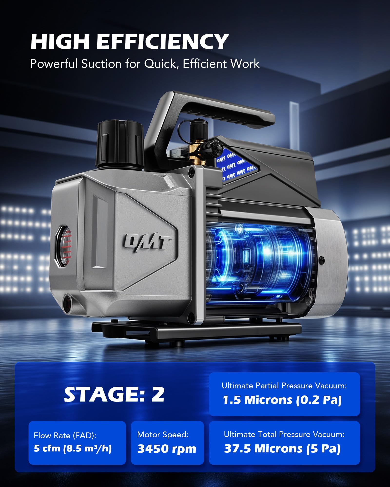 - High Pumping Efficiency: Equipped with a 3450 rpm motor, this auto ac vacuum pump delivers 5 cfm and quickly pulls down systems to 1.5 microns (0.2 Pa), making evacuations faster and helping you get the job done in less time