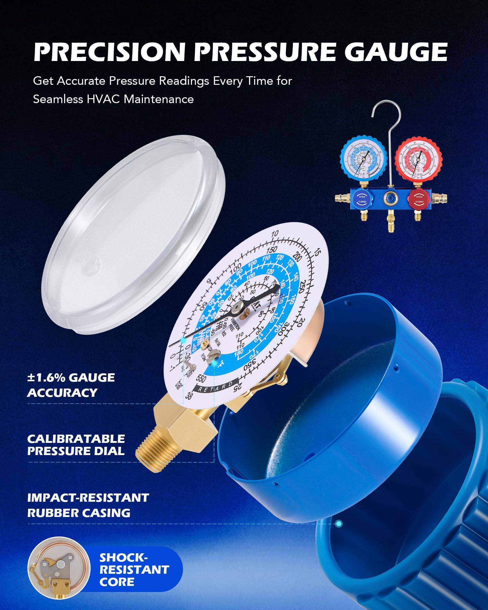 - High-Precision Gauge: Our 3-way gauge delivers accurate pressure readings with every use. The clear dial makes it easy to read, and the convenient calibration adjustment ensures precise diagnostics for all your AC maintenance tasks
