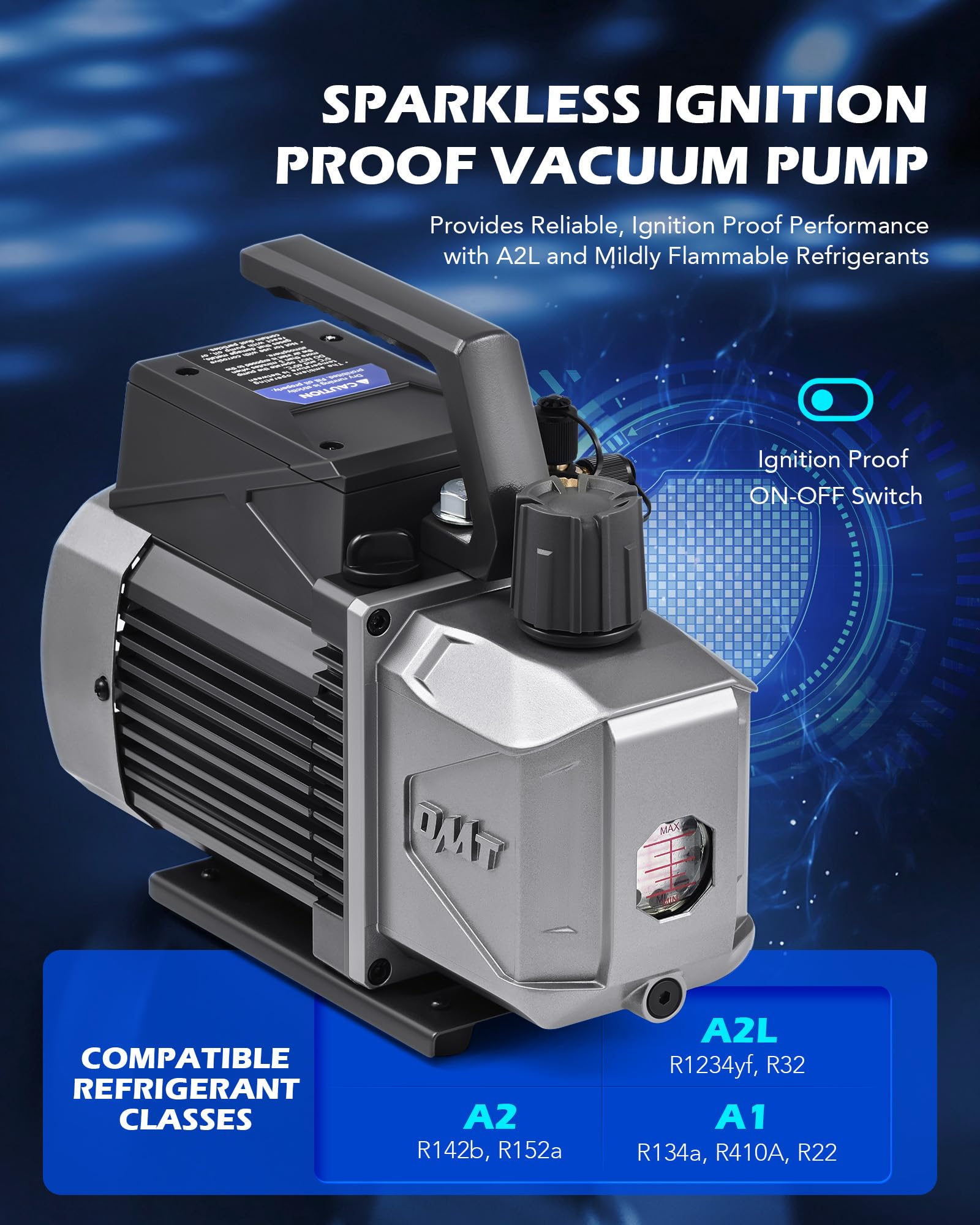 - Safe Sparkless Operation: Our sparkless vacuum pump, featuring an ignition-proof ON/OFF switch, ensures safe, spark-free operation when handling A2L or mildly flammable refrigerants, all while delivering reliable performance