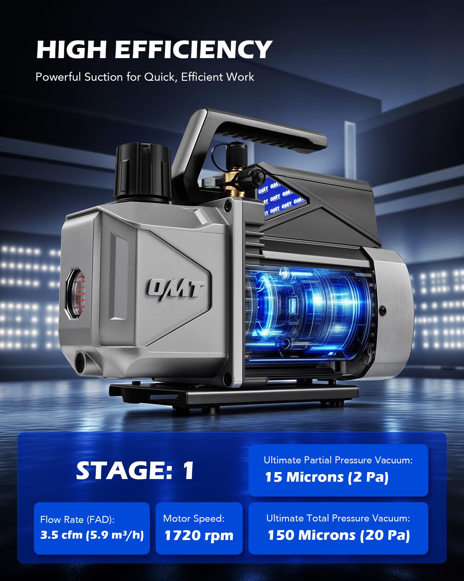 - High Pumping Efficiency: Equipped with a 1720 rpm motor, this auto ac vacuum pump delivers 3.5 cfm and quickly pulls down systems to 15 microns (2 Pa), making evacuations faster and helping you get the job done in less time