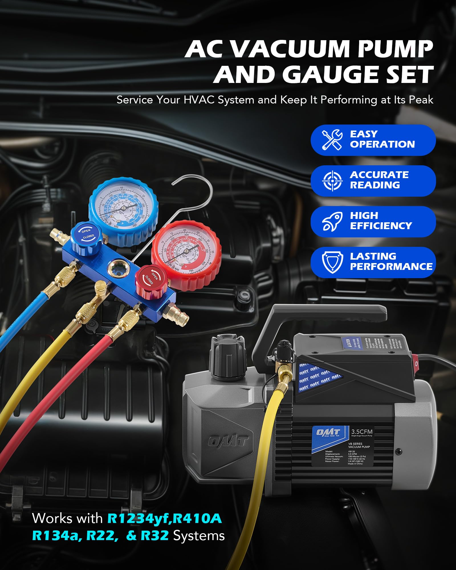 - Auto AC Service Set: Orion Motor Tech’s auto AC vacuum pump kit includes a 1/4 hp vacuum pump, a 3-way manifold gauge, R134a & R1234yf self-sealing can taps, R134a quick couplers, R134a to R1234yf adapters, vacuum oil, and 3 hoses for most AC repair works