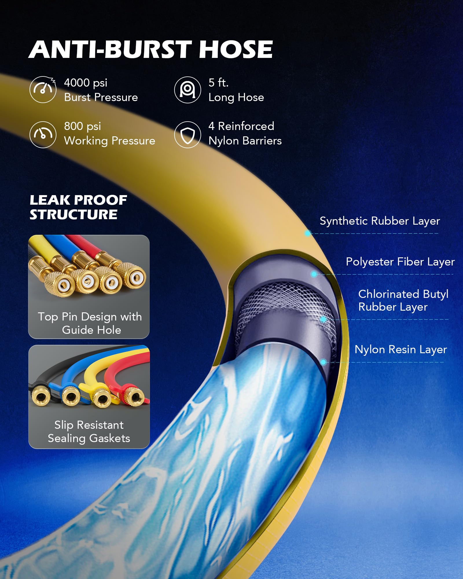 - Color-Coded Hoses: The color-coded PVC hoses of this HVAC gauge kit have 4 reinforced layers to work with pressure up to 800 psi (burst pressure: 4000 psi)
