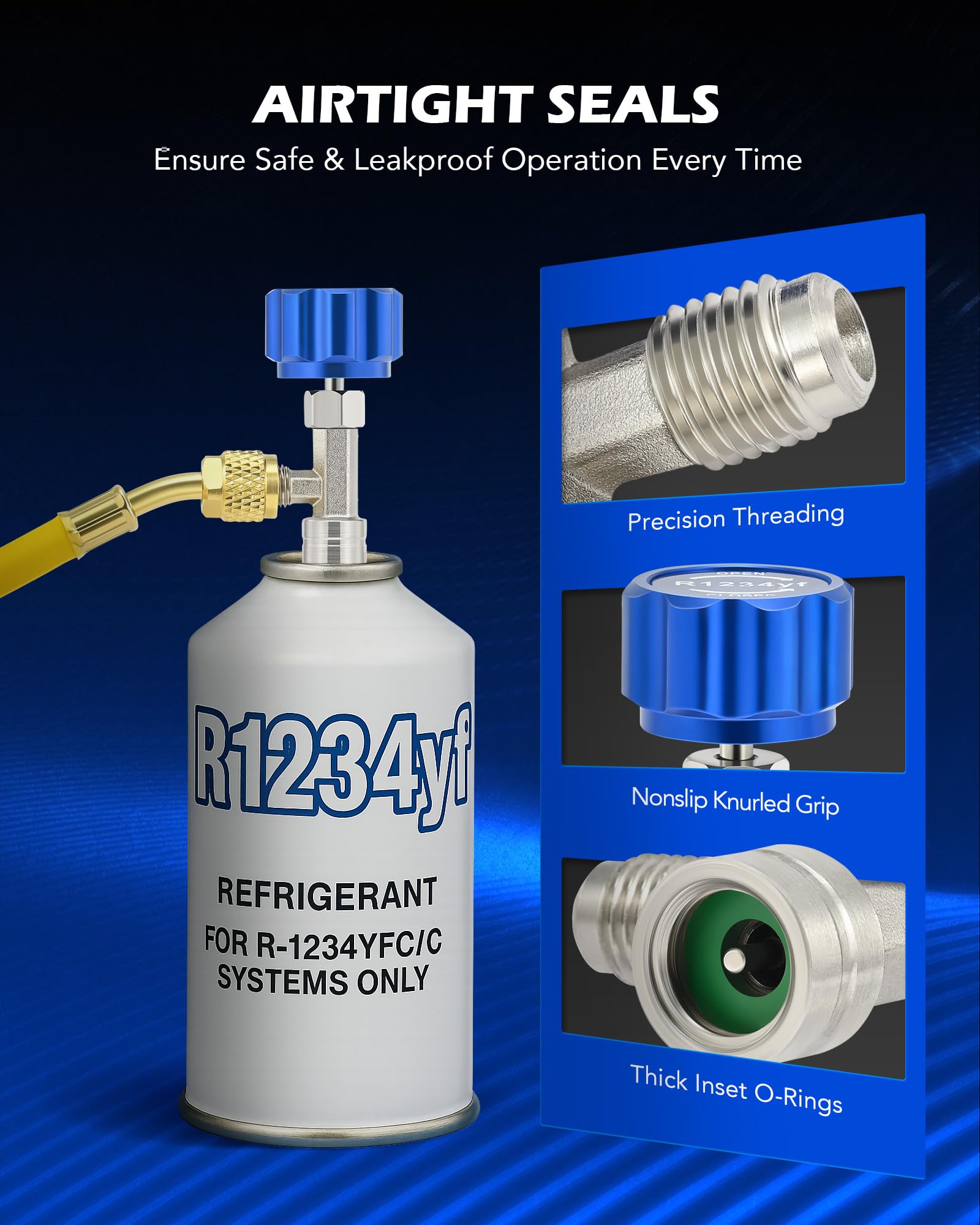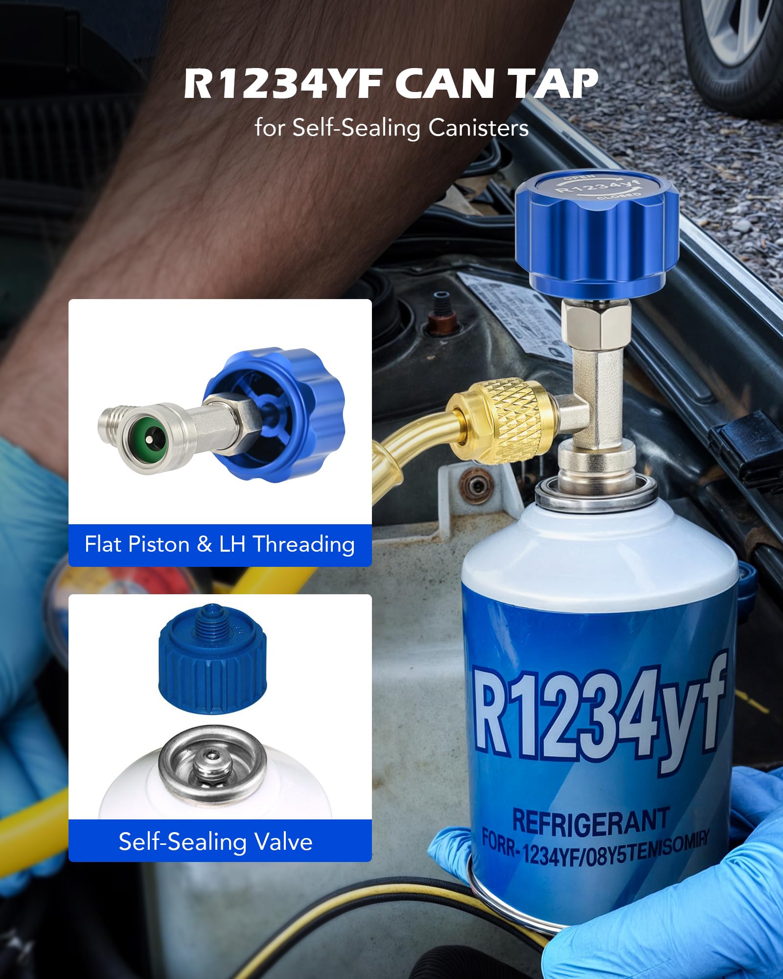 - R1234YF CAN TAP: This Orion Motor Tech refrigerant opener taps all standard self sealing style R1234yf cans to allow quick and easy recharging of the coolant in your car, truck, SUV, or other vehicle