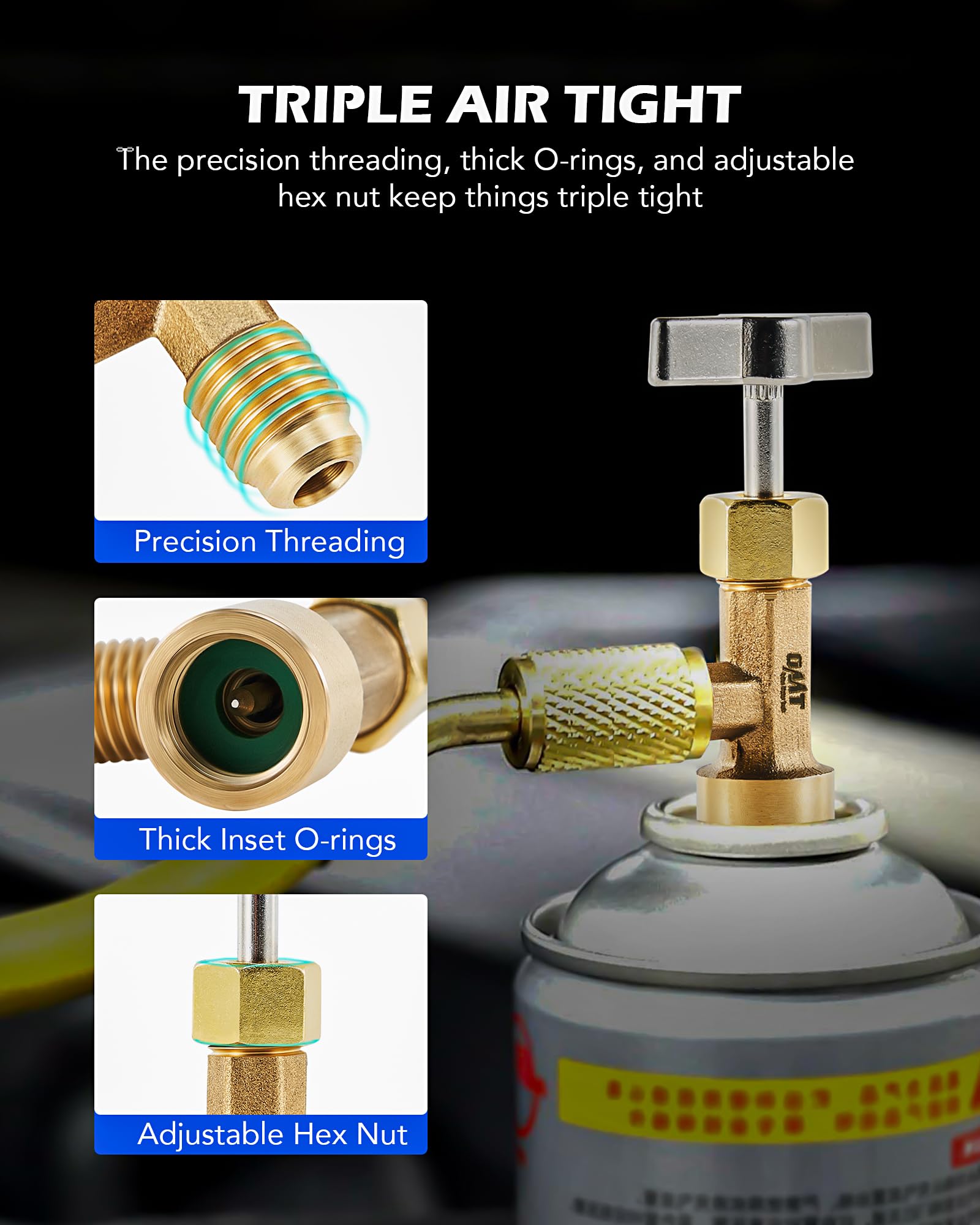 • 3-FOLD LEAK PREVENTION: The sharp pin, precision threading, and thick O-rings keep things triple tight for safe and leakproof refrigerant recharging every time