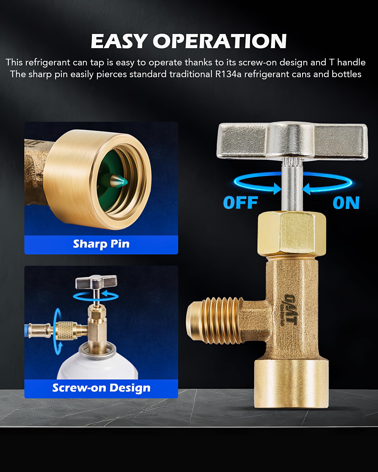 • R134A CAN TAP: This Orion Motor Tech refrigerant opener taps all standard puncture-style R134a cans to allow quick and easy recharging of the coolant in your car, truck, SUV, or other vehicle