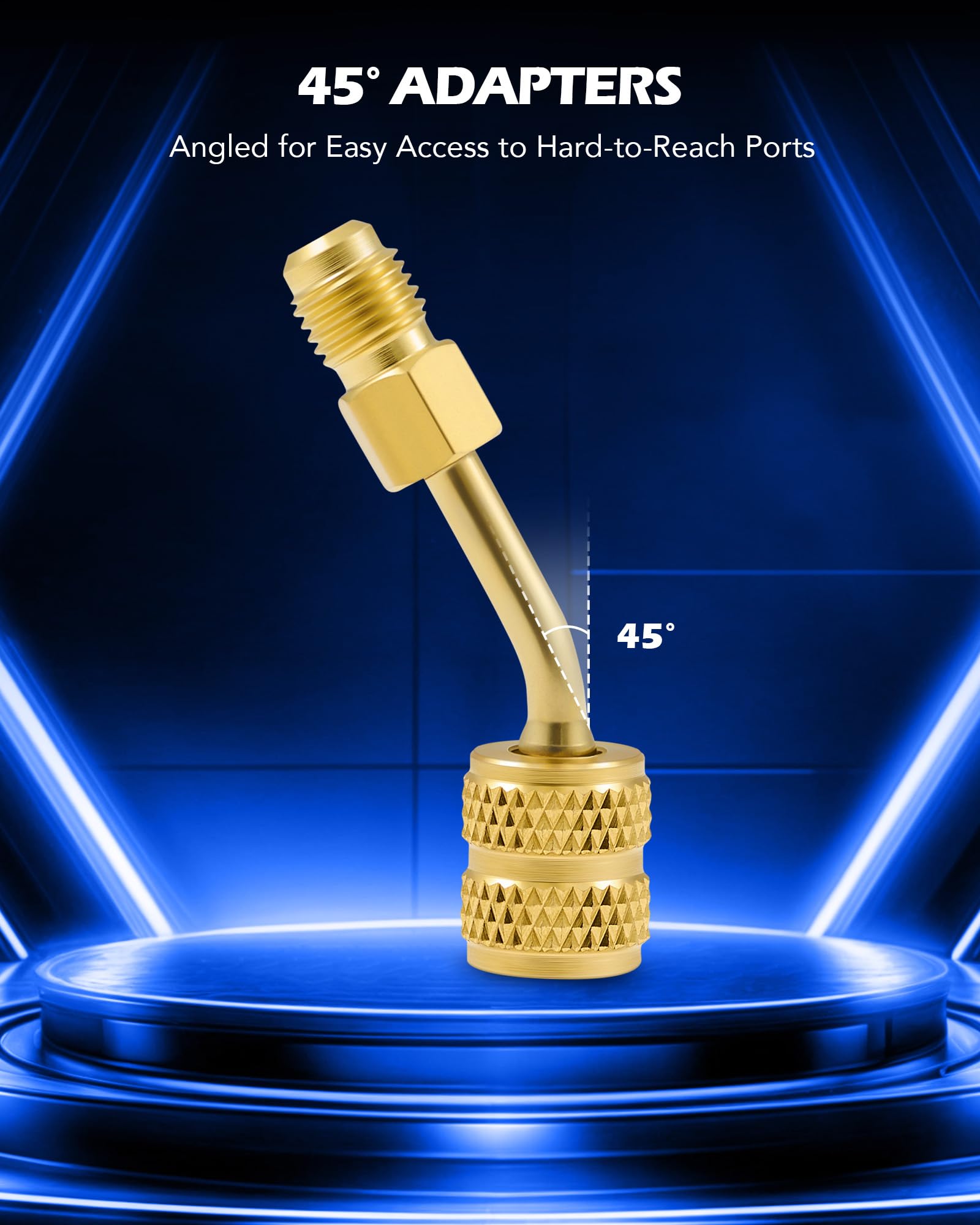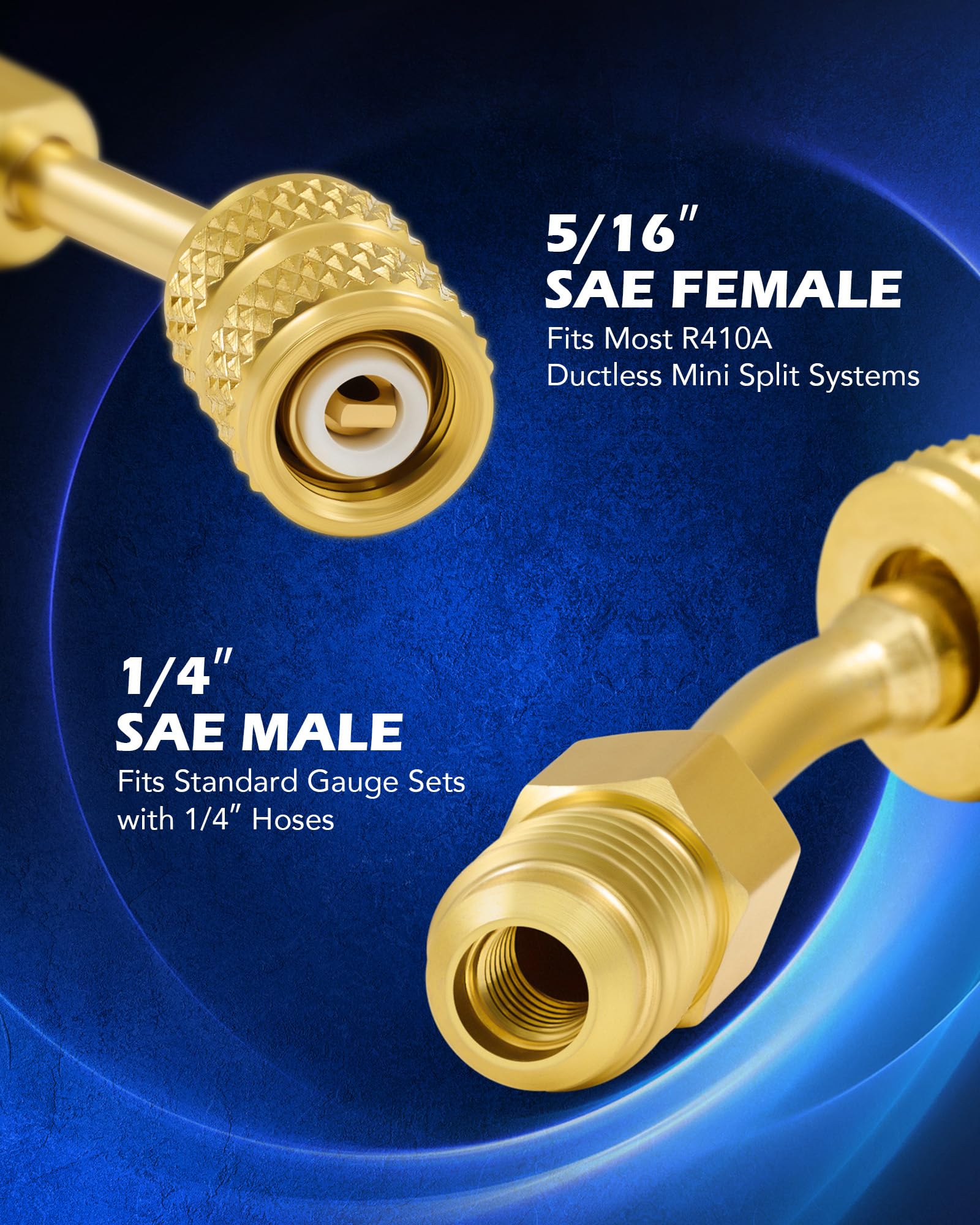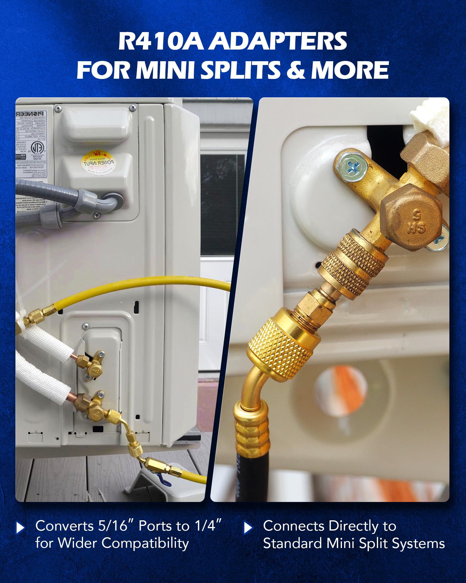 - R410a 4 PACK: This R410a adapter set includes 4 angled adapters with 1/4 inch male flares and 5/16 inch female ends, able to keep your HVAC diagnostic and service equipment compatible with most new R410a mini splits and other systems