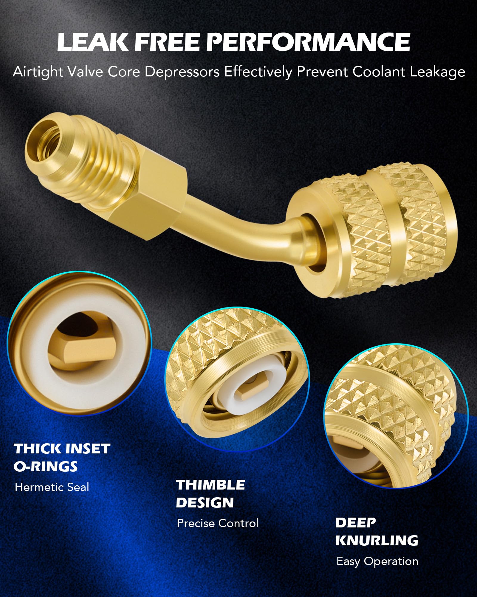 - EASY OPERATION: The knurled grips make it simple and convenient to install, tighten, and remove these R410a fitting adapters, and the 45° angled pieces ensure easier access to even hard-to-reach ports
