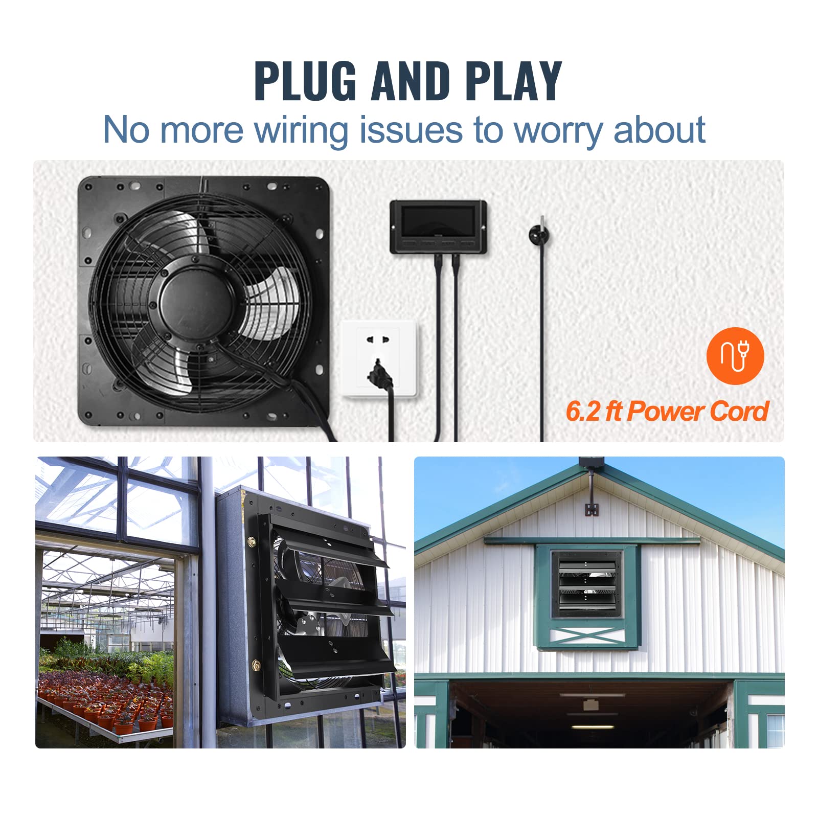 - Plug and Play: Get ready to fly through the installation process! Our wall exhaust fan comes fully assembled and ready to install right out of the box. Includes 4 bolts. You’re ready to go by connecting the 6.2 ft power cord. No more worrying about wiring! Works well for garages, workshops, chicken coops, windows, attics, greenhouses, etc.