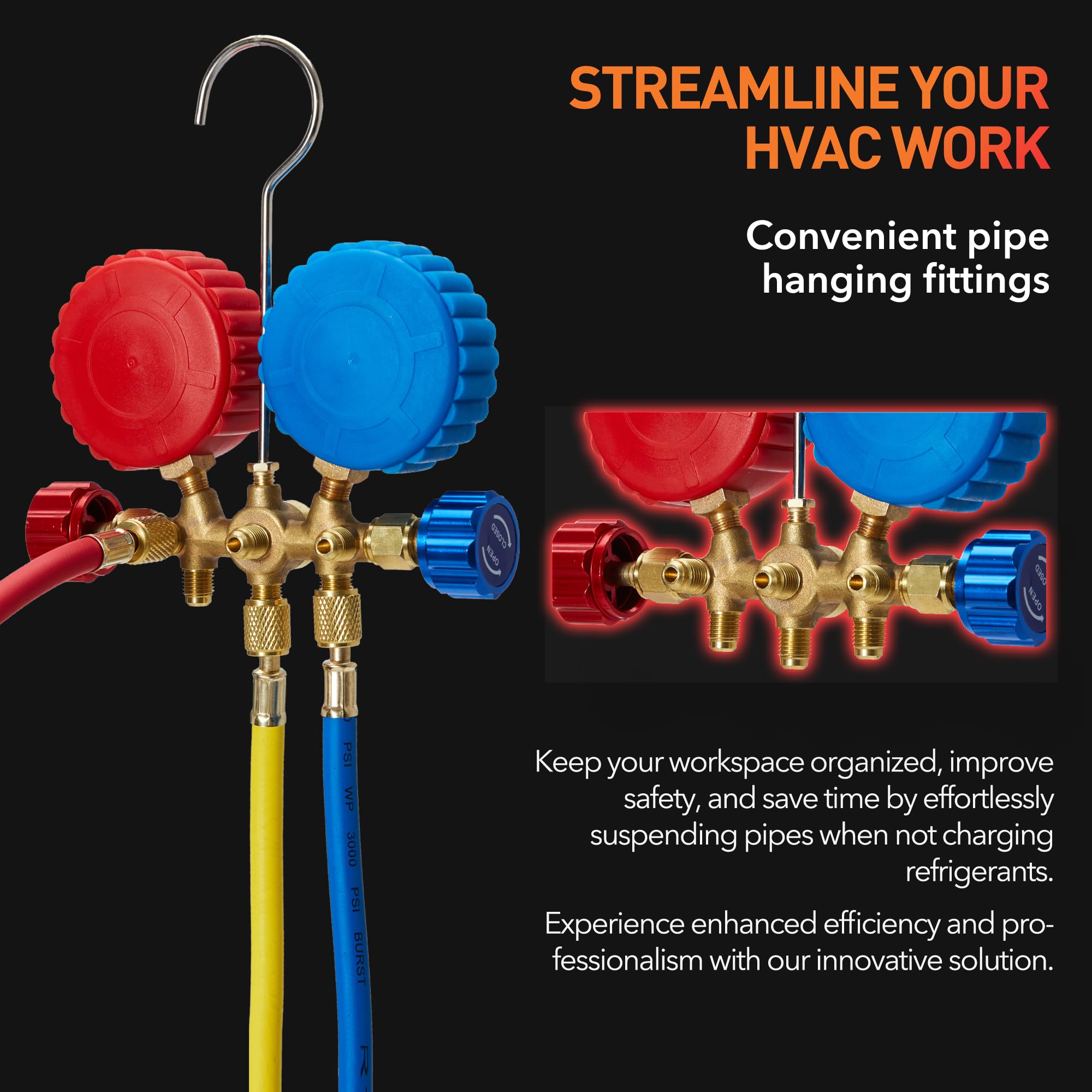 - Three Durable Hoses: The AC manifold gauge set comes with 3 pieces long 5ft hoses that ensure flexibility and ease during use. Red for high side, Blue for low, Yellow for charging, these three PVC hoses have 3 layers to work with pressure up to 600 psi and 3000 psi burst pressure