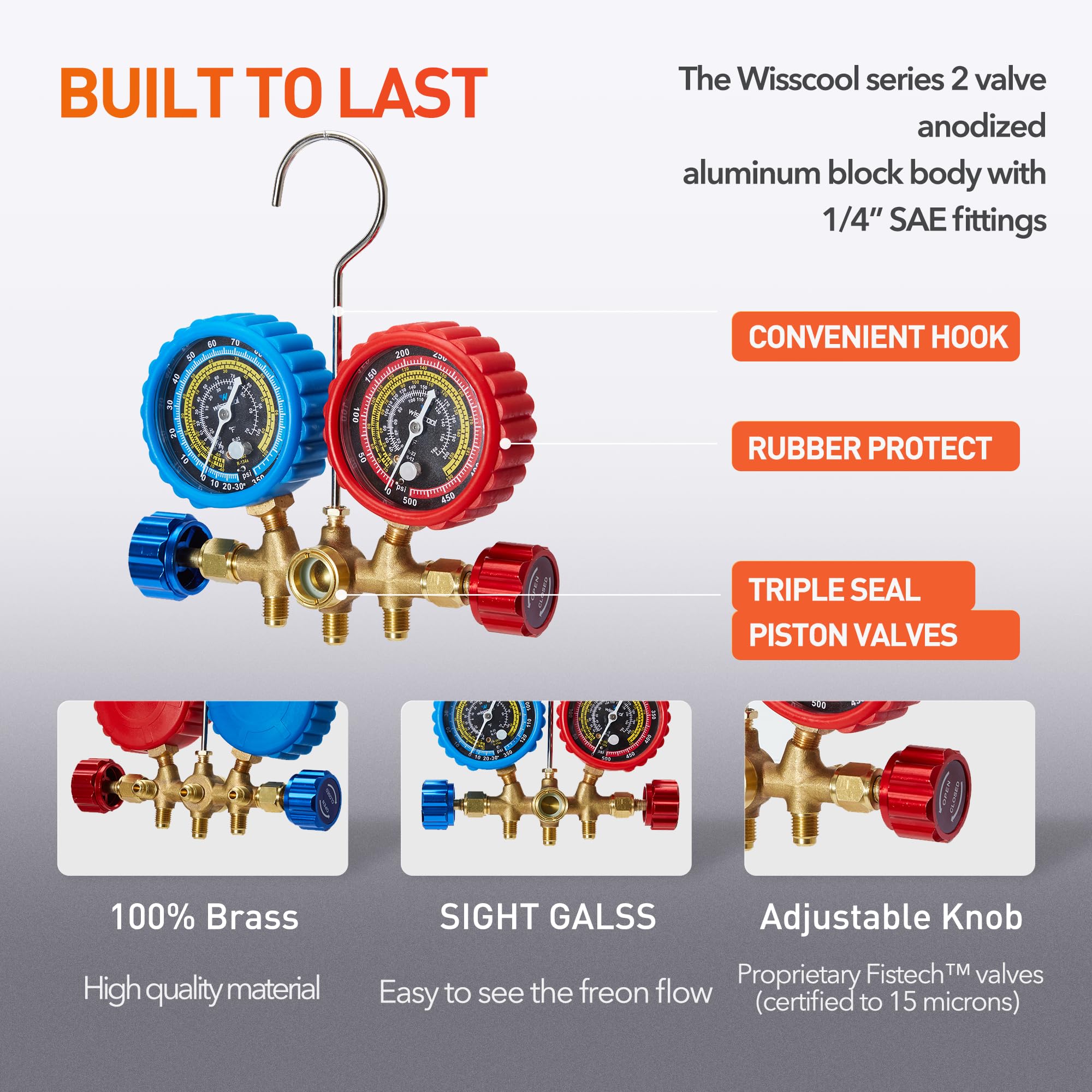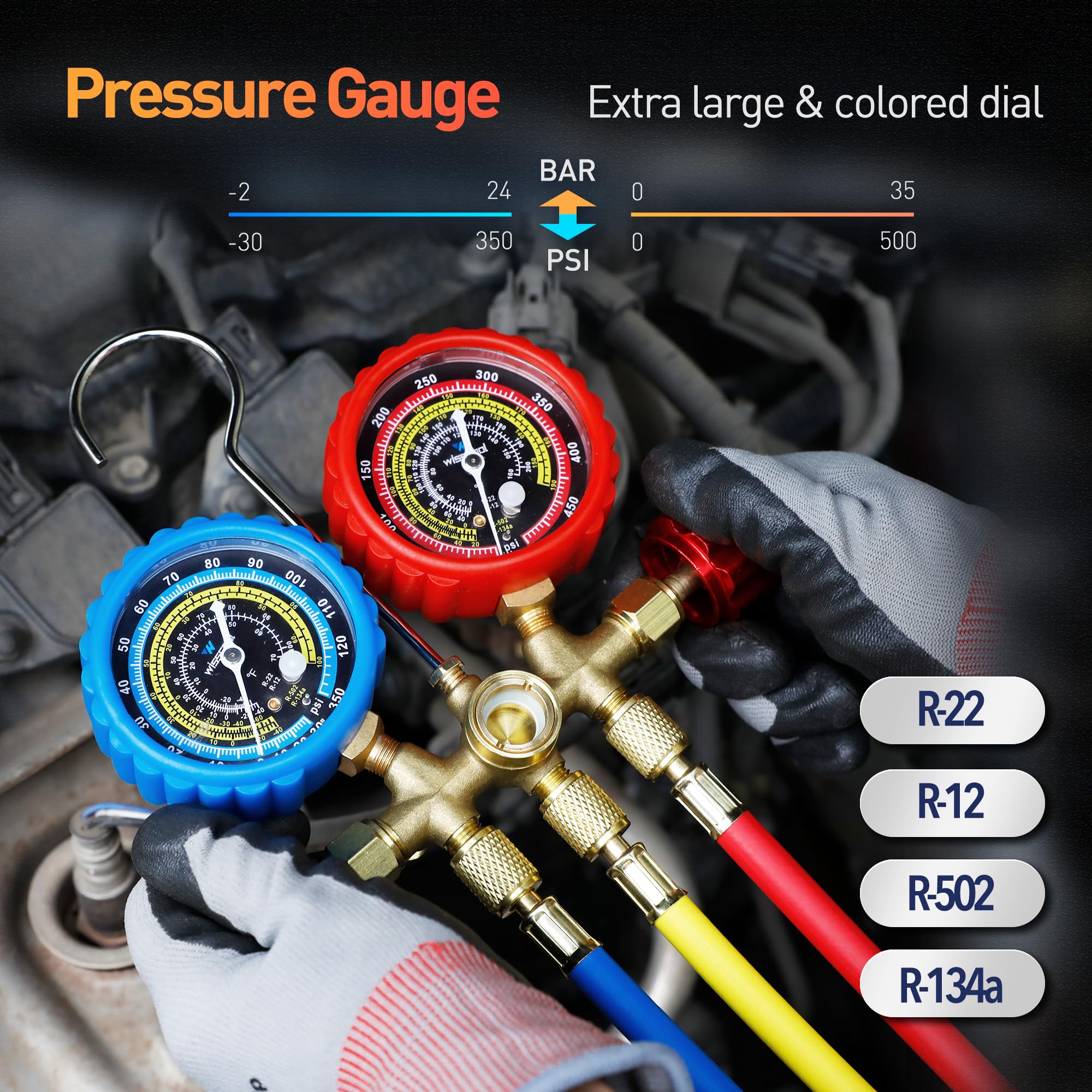 - Comprehensive AC Gauge Set: The WISSCOOL R134a R12 R22 R502 AC Gauge Set is a complete solution for HVAC professionals, featuring an automotive 3-valve AC manifold gauge designed for AC freon charging, evacuation, diagnostic check and recovery work