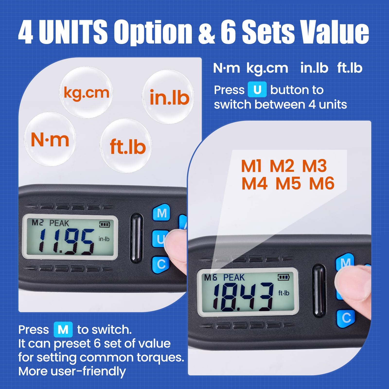 • Convenient User-friendly: The electric torque wrench provides 6 groups of preset values from M1 to M6, so you can set up several groups of commonly used torque values in advance. The handle of wrench has non-slip design.With its ergonomic design, it offers a comfortable grip and easy operation. Whether you’re a professional worker or home user, it ensures a comfortable experience