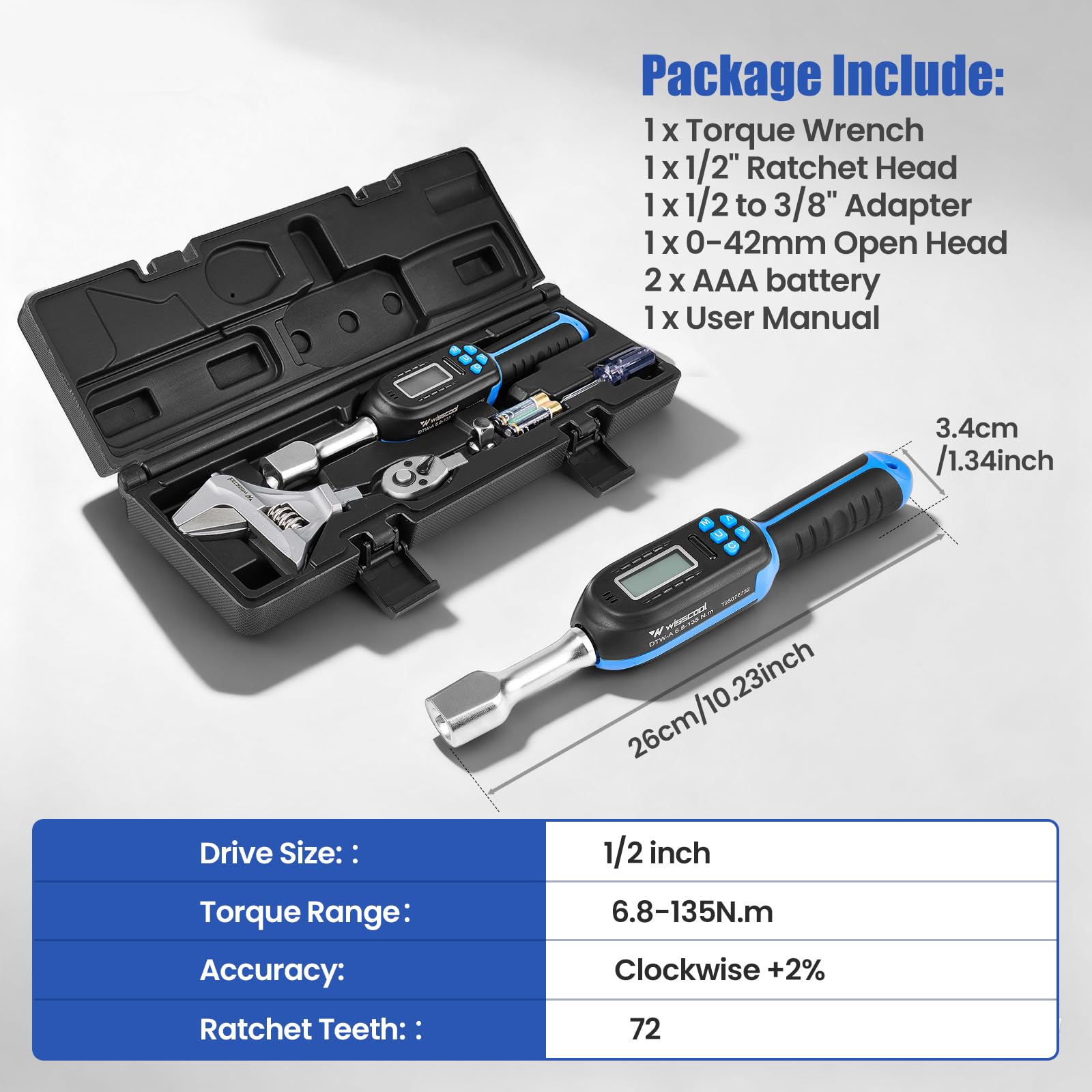 • Powerful Torque Wrench Package: Package Includes digital torque wrench x 1, 1/2” drive ratchet head x 1, 1/2” to 3/8” adapter, 43mm open head x1, AAA Batteries x 1, Storage Case x 1. Please do not overload the wrench. Exceeding 120% of the maximum torque value may damage the wrench.The wrench can be clean with a dry towel
