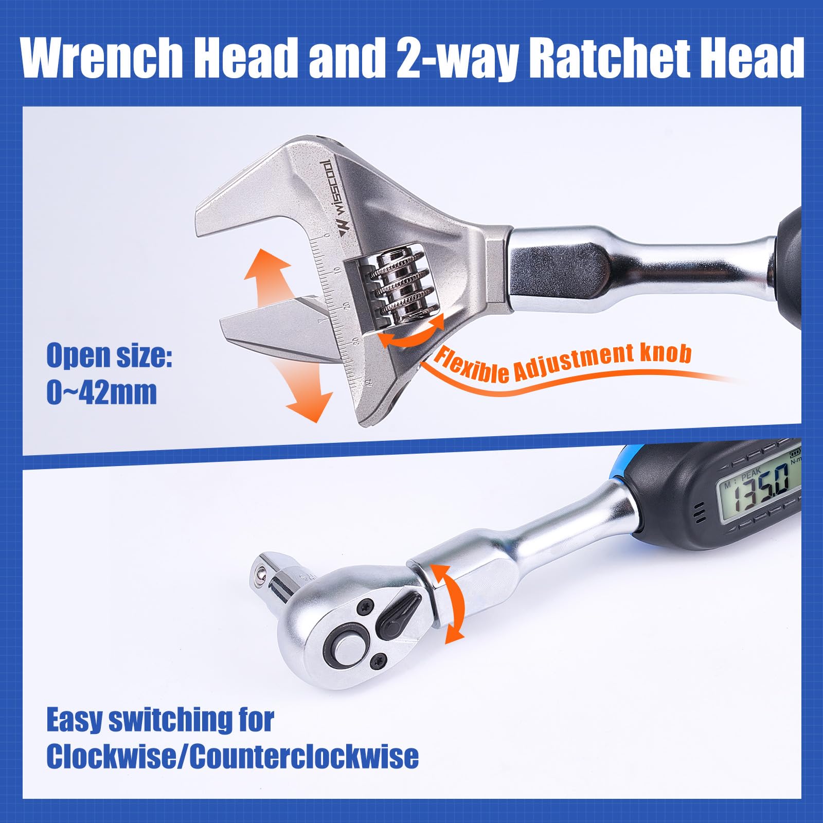 Details: The WISSCOOL Digital Torque Wrench is a high-precision tool engineered for both professionals and DIY users who demand accuracy and reliability. With a torque range of 5–99.6 ft.lb (6.8–135 N.m) and an impressive ±2% accuracy, this torque wrench ensures every fastening job is completed with confidence. Designed for HVAC installations, split AC systems, motorcycles, bicycles, and car repairs, it is a versatile powered torque wrench suitable for a wide range of applications.Equipped with a 1/2″ drive ratchet and a 3/8″ adapter, this digital torque wrench offers flexibility to handle different bolt sizes and tasks with ease. The 42mm jaw provides a secure fit, while the advanced digital display delivers real-time readings to eliminate guesswork. To further enhance precision, the torque wrench digital system features vibration, a buzzer, and LED indicator alerts that notify you instantly once the preset torque value is reached, preventing over-tightening and protecting your equipment.Built with ergonomic design in mind, the WISSCOOL digital torque wrench is comfortable to use even during long working sessions. Its durable construction ensures lasting performance under tough conditions, while the compact size makes it easy to store and transport. Whether you are tightening critical components in an HVAC system or performing detailed maintenance on vehicles, this digital torque wrench is a dependable partner. Combining modern technology with rugged practicality, the WISSCOOL torque wrench delivers accuracy, safety, and efficiency for every project.