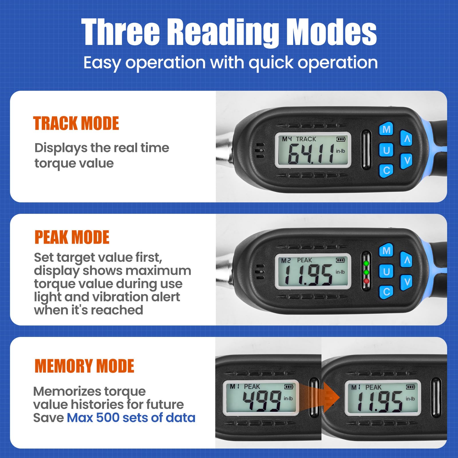 • 3 Modes 4 Units Switching: This adjustable torque wrench has three different operating modes, including Tracking mode, Peak mode, Memory mode.The wrench can store up to 500 sets of data. Easy to check the historical data. You can choose peak mode when you need to keep the maximum value. Also you can choose track mode when you need the torque value to change in real time with the amount of force. WISSCOOL digital torque wrench supports four units of measurement (N.m, ft-lb, in-lb, kg-cm), making it versatile for various mechanical tasks
