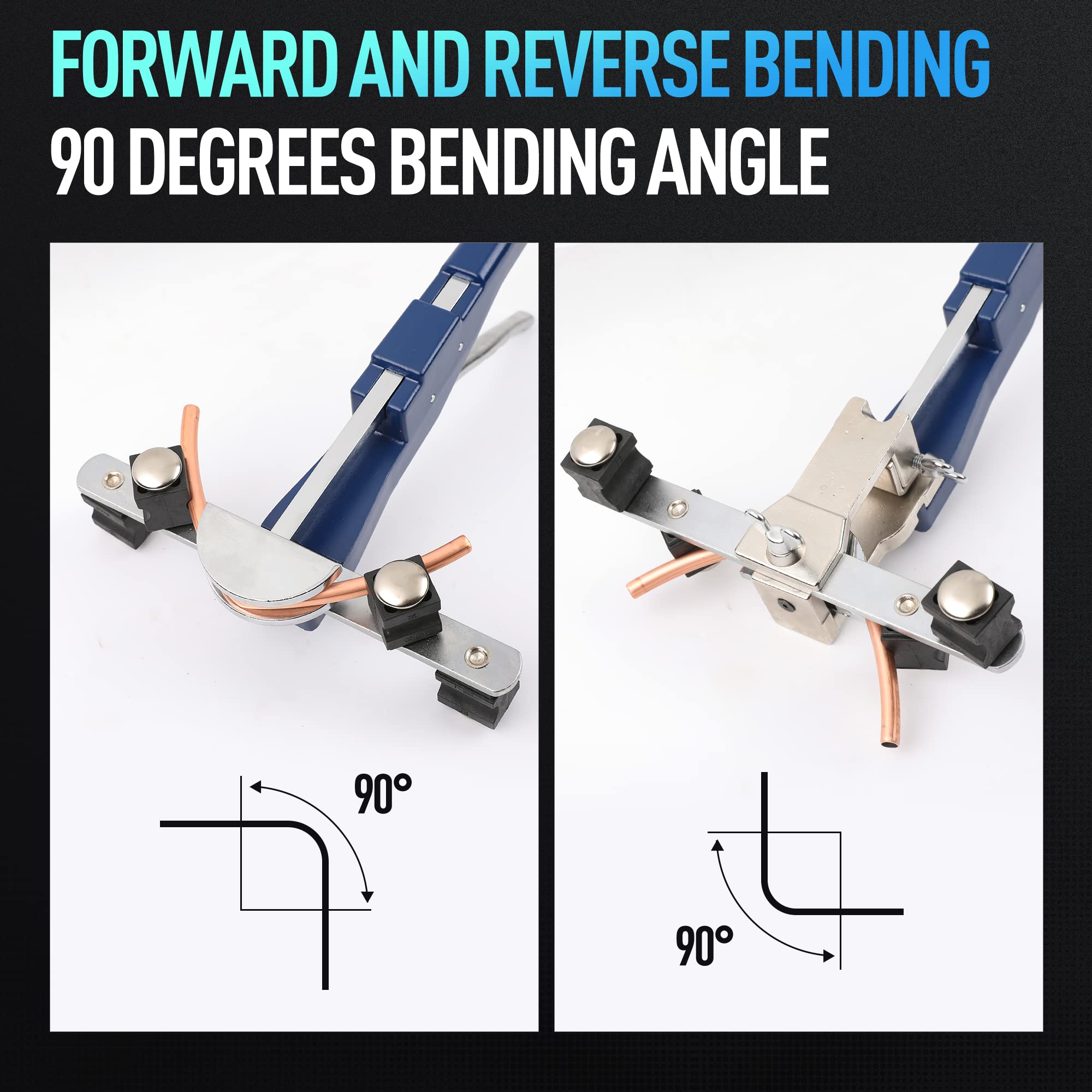 • Two Directions 90°Bending: The compact tubes bender kid is perfect for bending copper/aluminum pipes to 90 degrees.Press lever until requested angle up to 90° is achieved, then release the lever to retract the mandrel for easy tube removing.Also “Forward” and “Reverse” configurations make it suitable for small areas.You can bend pipes fast and precisely with mechanical ratchet.