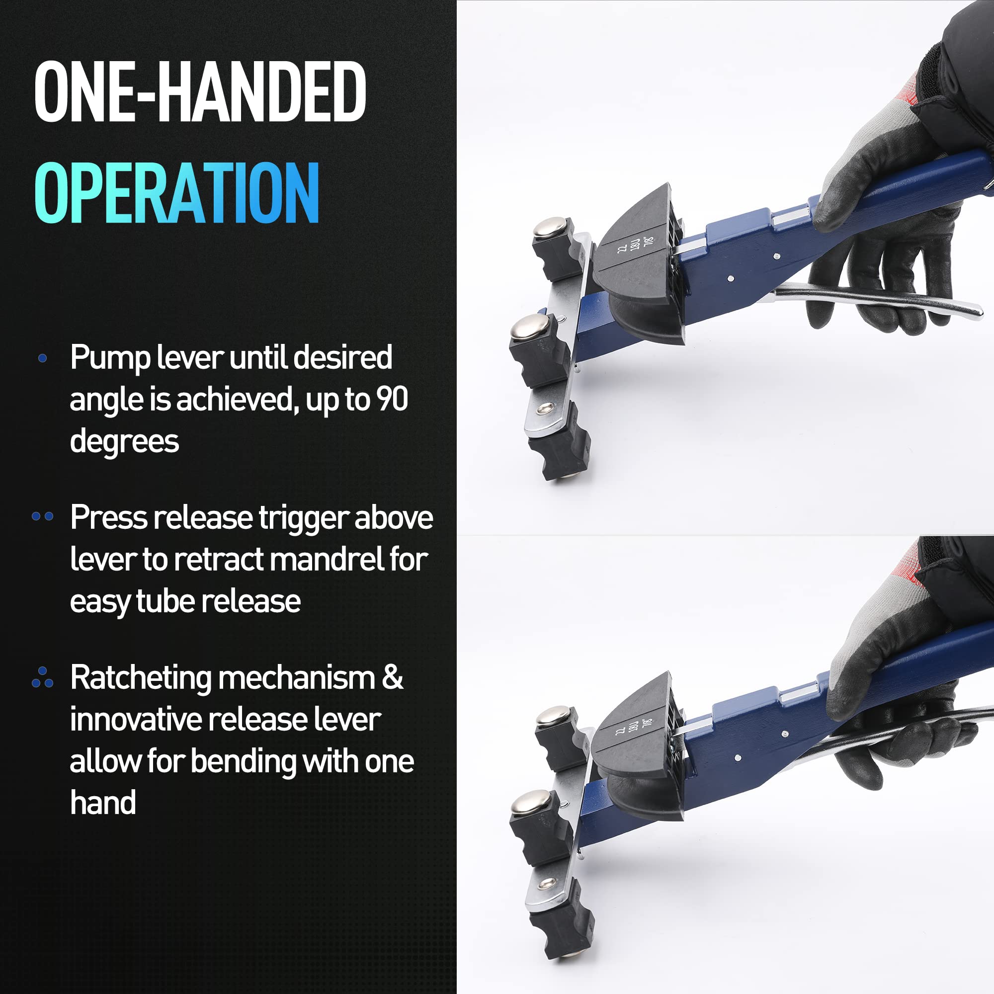 • Convenient Operation: Only one hand is needed for bending by using the tube bender. Extra-long handle increases leverage and reduces hand fatigue.Compact design and Lightweight body take up less space and effort. It can enhance efficiency of use, control, and precision while completing bends.