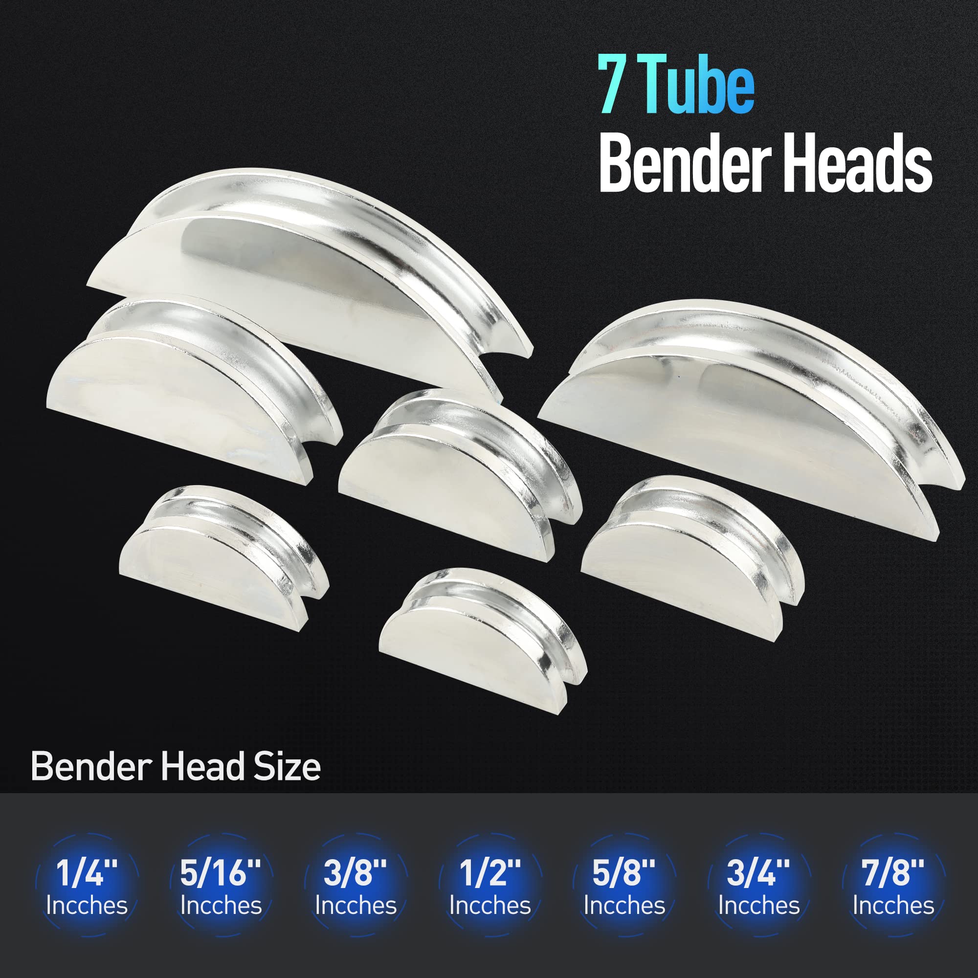 • Complete Set Aluminum Multiple Dies: The reinforced bending heads are strong and durable. The tubing bender tool set accommodates wide range of interchangeable tubing sizes, including 1/4″, 5/16″, 3/8″, 1/2″, 5/8″, 3/4″, and 7/8″; Also contains other auxiliary tools like bearing-type pipe cutter and a deburring tool.