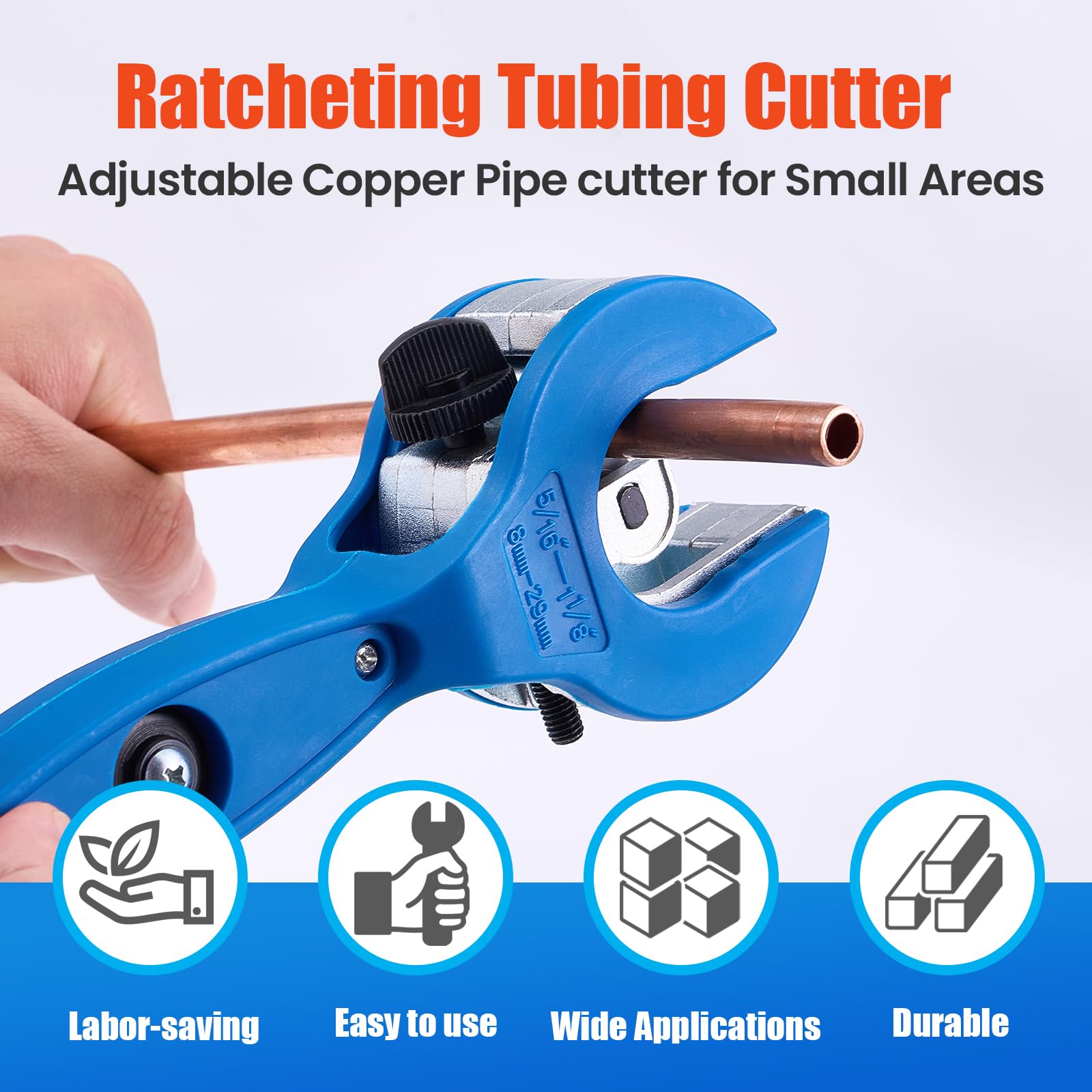 • Versatile Ratcheting Cutting: Effortlessly cuts through various tubing materials (copper, plastic, PVC) from 5/16″ to 1-1/8″ (8mm to 28mm) diameter using a powerful, self-ratcheting mechanism that requires minimal hand pressure
