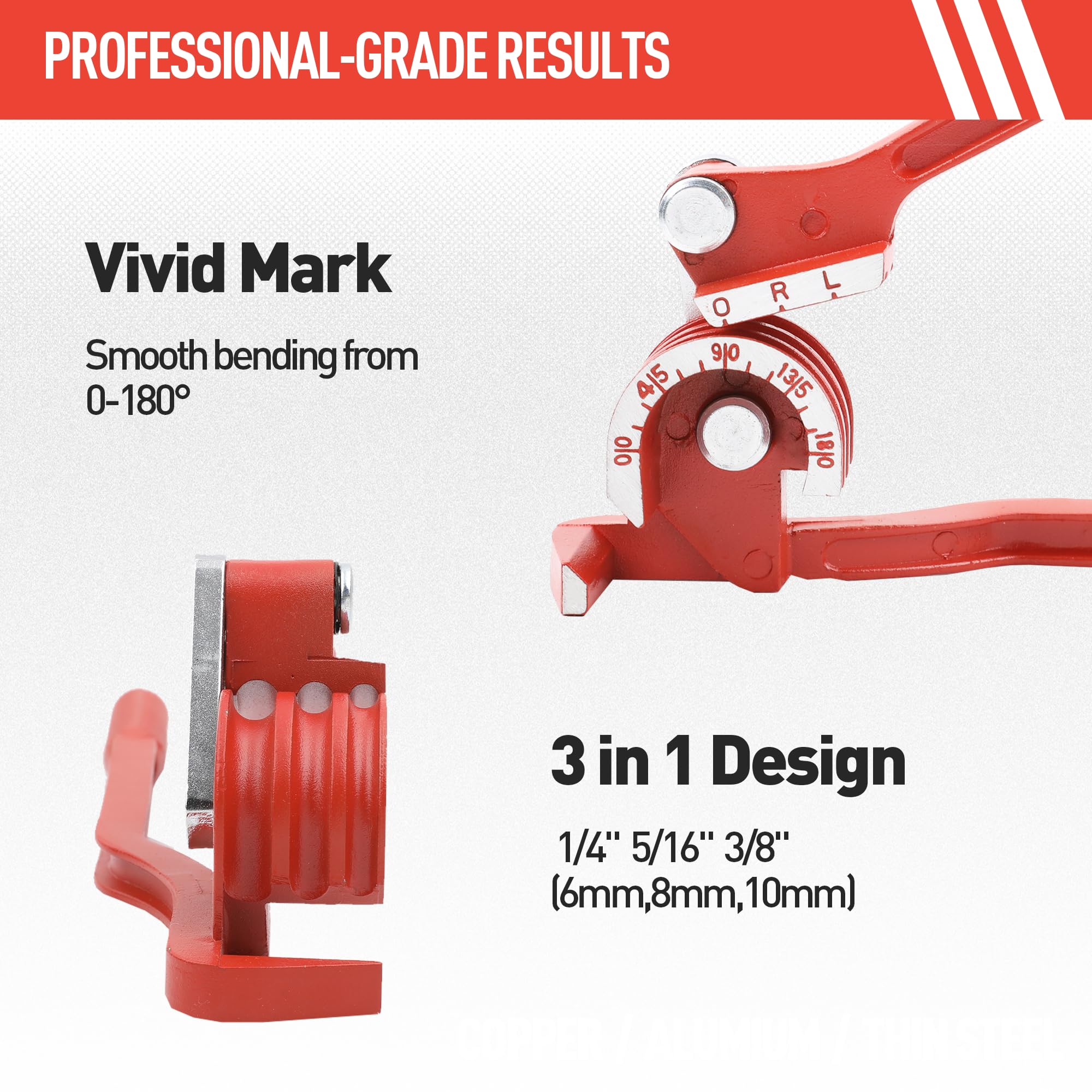 - 3-in-1 Versatile Bending: Effortlessly bend 1/4″, 5/16″, and 3/8″ diameter pipes with a single, compact tool – no need for multiple benders